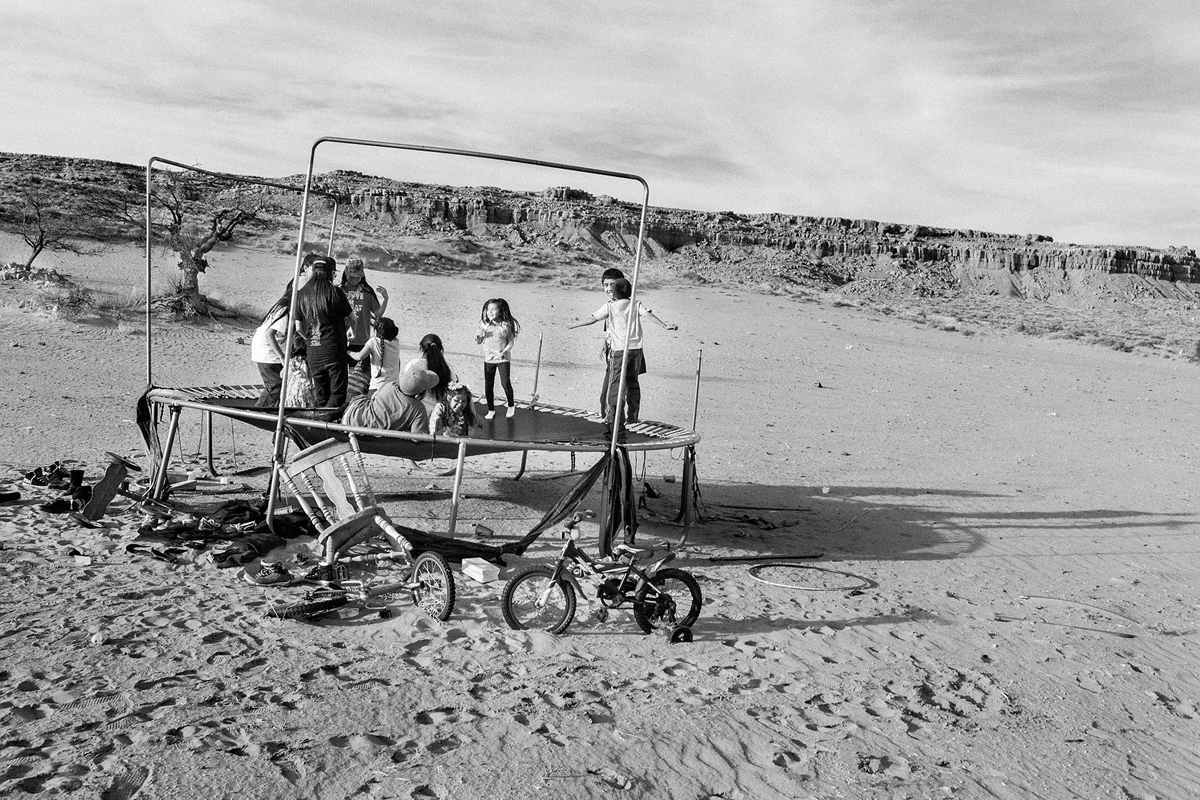 Top, in the village of Kykotsmovi, kids celebrate the 2nd birthday of Jaycee Hongeva by jumping on a trampoline. © Tomas Muscionico